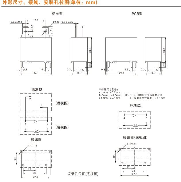 觸點形式繼電器常開或常閉(常見4、6只腳)、轉換(常見5只腳或8只腳)