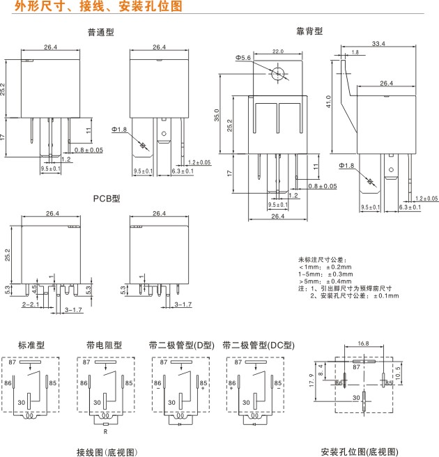 觸點形式繼電器常開或常閉(常見4、6只腳)、轉換(常見5只腳或8只腳)